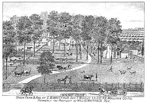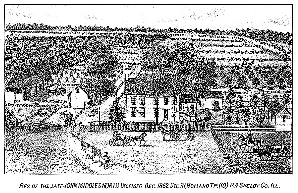 Hunters would come and go, remain a short time hunting and trapping, and then go elsewhere. Josiah Daniel built a cabin on Brush creek, trapped and hunted for a living, and left, after the Mexican war, for Missouri -- this country was settling up too fast for him. Zane Daniel hunted and trapped here for a short time on Brush creek. Jacob Elliot came to this country and settled on the head waters of Richland creek, in what is now Richland township in 1825. He came here from Clay county, Ill., where he lived for three years. He was originally from North Carolina; his parents moved fro m that State to Indiana when he was quite young. In 1837 he moved farther down the Richland creek on account of milk-sickness, and settled where he now lives. The cabin he built in 1837 still stands and is a part of the house he now occupies. For a number of years he went to Cold Spring to Wakefield's horse mill to get his grinding and would often have to wait all night for his grist. In those days the green headed flies were very numerous and almost an Egyptian plague. They became so troublesome that dur ing two months of the year in fly time, travelers were obliged to go on their journeys at night, and even then they were troubled to some extent. Their bites were so severe that a horse, if turned loose during that season of the year, was liable to be goa ded to death with pain, loss of blood and incessant kicking and running to become rid of these insects. They were the most troublesome on the main roads where travelers usually passed with their teams. Edward Pritchard settled on Jordan creek in 1832. John A. Pritchard made an improvement near the center of the township in 1842. Daniel and Jacob Gallagher, two brothers from Fairfield county Ohio, came into the county in 1839. Daniel settled the place on section twenty-nine, the same year, where he lived until his death. Jacob resided in Shelbyville township for two years, and th en removed to where he now lives, in l841. For some time after the Gallaghers settled here there were only three houses north of them in the township, viz: E. Howe, M. Owens and John Pritchard, and a few " squatters " lived along on the north side of the creek in the timber south of them. E. Howe settled on section seventeen, now the S. Wilhelm place. M. Owens settled the A. Hahn place, on the north side of Jordan creek. John Middlesworth came here in 1838 and settled on section thirty-one, where his widow now resides. He was from Fairfield County, Ohio. A view of the household is shown on another page of this work. Charles Reber also from Ohio and the same county, locate d on section thirty-two the same year; he only remained here about two years and then returned to Ohio. Wesley and Henry Gallagher settled on section four in 1840. The first school-house was built on section twenty-nine, near Gallagher's about 1845; it was a small log building. William Howe was one of the first teachers. Other early settlers of Holland who deserve mention are John Black, George Supernoskite, W. J. F . Howe, J. B. Leathers, J. Hubbart and C. Giles. Brush Creek post-office was established a number of years ago on section twelve, in the south part of the township, with D. M. Fitch as postmaster; the office was kept as his residence. It was discontinued about four years ago ; the office had an existenc e of about two years at this place.