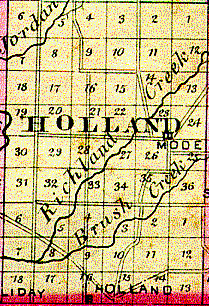 HOLLAND TOWNSHIP. (SHELBY COUNTY.) THIS township contains fifty-four sections, the north half of town nine, range four east, and the whole of town ten, range four east. The greater part was originally timber; part of the surface is quite broken in the central and northern portions o f the township; there is also good prairie land, and generally well-improved. There were no very early settlements made here. The Okaw river flows throughout part of sections nineteen and thirty. Jordan creek passes through the north-west part of the town ship, -- it enters it in section five, touches section eight, and passes out in section seven. Richland creek flows through almost the entire township in a south-westerly direction. Brush creek -- a tributary of Richland creed -- drains the southern part of the township, where it enters Jordan creek in section eight, town nine, range four. The township is bounded on the north by Shelbyville township, west by Dry Point, south by Effingham county, and on the east by Prairie township. Elisha Fortner, one of the first settlers of this township, came to Shelby county in 1829, and first located in the Sand creek settlement. In 1834 he came down into what is now Holland township. His widow tells of being frightened by a painted Indian, who , because of some grievance, took this plan of revenge: the Indian sat grumly on his horse, without speaking, in front of the cabin. Mrs. Fortner had securely fastened the door, and trembling, watched his motions through a crack between the logs. Actions of this kind appeared a little threatening, but the settlers paid no attention and were not molested. It is the almost unanimous expression of the early settler, that the Indians were the best of neighbors. As a general thing they were polite and friendly . David Miller, a native of Tennessee, came to Shelby county in 1828, settled three miles east from Shelbyville, where he lived six Page 294 or seven years, and then located on Richland creek, in the southwest part of Holland.