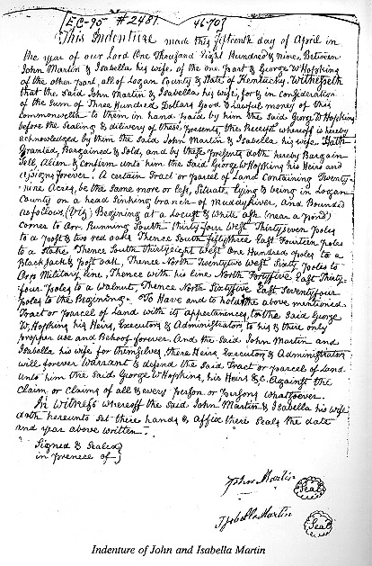or to discover where the family was prior to 1797 run squarely into the problem that we do not know if references to "John Martin" are to our John Martin. (Appended to this introduction is a note on some of the John Martins who were in Virginia, North Carolina, Pennsylvania, or Kentucky during the period from 1760-1820.) The parcel of land in Logan County on which John Martin lived starting in 1797 and which was sold in 1809 (in two pieces -- one of 170 acres to Thomas Morton, another of 29 acres to George Hopkins) was located near the headwaters of the Muddy River, about 7 miles east of Russellville, astride the Bowling Green Road connecting Russellville and Auburn (near what is now Dennis). (See the original survey, modern platting of that survey, and map appearing in the illustrations.) The "Indenture" for the transfer of the 29-acre portion of the land of John and Isabella Martin to George Hopkins, dated April 15, 1809, shows what app ear to be the signatures of John and Isabella (see the illustrations). Nearby (at least part of the time), also near the Muddy River, was the home of Charles and Jane Neely. Charles had married John and Sarah's daughter, Jane, in Logan County in 1797. Logan County tax records for 1802-1808 describe the Neely property as near the Muddy River. Also, a survey performed in 1804 describes 200 acres of land surveyed by David Neely as sharing a common line with John Martin's land, and also as adj oining Charles Neely's land. However, Charles and Jane apparently moved around. In the 1814 tax records, Charles Neely's land is located on Little Whipporwill, and in 1816 he is listed with land located on the Red River. According to an indenture of sale made after Charles Neely had moved to Illinois, one parcel of his Red River land, patented July 29, 1815, was located on the Kentucky-Tennessee state line. Charles sold this 194-acre parcel of land on August 18, 1818, for $448.28 to John Neely, Jr. He sold another parcel of Red River land--200 acres--to Elisha Wickware on August 30, 1820. Grandfather thought the family might have left Kentucky for Illino is about 1803, but conceded this was "little more than a guess." (Infra , at 116). In fact, it appears that the family did not leave Logan County until 1817. This appears from two sources. First, as already shown, the property tax records list John Martin and his sons as taxpayers through 1817. Second,, Baptist church records indicate that John Martin and others in the family were active in local church affairs from 1804 through 1816, after which time John's name no longer appears in those records. Grandfather knew, of course, that several of the sons and grandchildren of "Old John" were Baptist preachers, but he did not know that "Old John" was also a Baptist preacher. Here again we run int o the name problem. We know there was a John Martin (or, theoretically, perhaps more than one) who was an active Baptist preacher in the Russellville area from 1804 through 1817. For example, in December 1805 John Martin was granted leave by the Count y Court of Logan County "to solemnize the rites of matrimony." (Logan County Order Book No. 3, p. 289, December 1805.) Was he our John Martin? Probably. During several of the years in question there was only one John Martin listed as a taxpay er in Logan County. Also, in the 1810 Census, only one John Martin is listed in Logan County (p. 165). The possibility that the Baptist preacher was a different John Martin -- perhaps even John Martin, Jr., son of "Old John" -- cannot be enti rely excluded. But it appears likely that our "Old John" was the Baptist preacher. On the premise that our "Old John" was the Logan County Baptist preacher, some of his church activities are worth recording. It is well established that John Martin helped John Hightower organize the Providence Baptist Church in nearby Warren County in 1804. Warren County was created out of Logan County in 1796. The early records of this church are now lost. The standard work on Kentucky Baptists, A History of Kentucky Baptists , by J.H. Spencer, 1886, has this to say about the Providence Church (Vol. II, at 252):