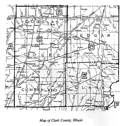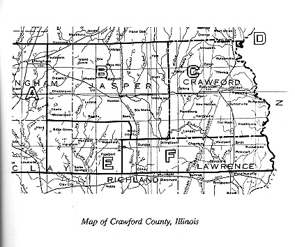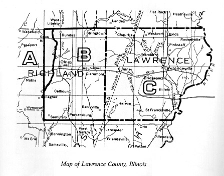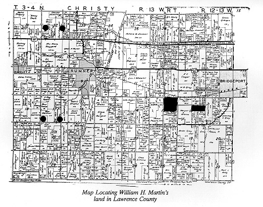 Harvey Martin (one of "Old John's" sons) to his second wife, Cynthia Clarke, in Lawrence County, Illinois, on December 13, 1821. This could have been a son, John Jr., but it seems to me it was more likely "Old John." Also, the History of Edwards, Lawrence & Wabash Counties, Illinois , Philadelphia, 1883, reports t hat: "William Martin, a Yankee, as the early settlers termed him, also came in the year 1817. He located with his family on section 18 [now Lawrence County, but part of Edwards County until 1821 when Lawrence was formed in part out of Edwards], w here he erected a cabin, tilled some ground and lived for about ten years, and then left the county. His father, John Martin, resided with him until his death, which occurred a few years after he came." (p. 327.) The history also discloses that, "The first school was taught by John Martin, on section 18, in a little log cabin, in the year 1819" (pp. 327-28, 161, 73). We are reasonably sure that this William is our William Harvey, so John is likely our "Old John." Wi lliam H. Martin first purchased land just southwest of Bridgeport, then Edwards (now Lawrence) County, on May 2, 1818 -- the NE 1/4 of Section 13, T. 3 N. Range 13 West (Early Land Record Book, p. 105 -- now located in the Courthouse at Lawrenceville). Eight years later, in 1826, he purchased a nearby tract -- the south 1/2 of the NE 1/4 of Section 18, T. 3 N. Range 12 West. (A map of Lawrence County showing the location of these two properties appears in the illustrations.) We know this is our Will iam because on April 29, 1847, William H. Martin and Cynthia Martin, of Moultrie County, sold this property for $27.50 to a Thomas Perkins (Book E, p. 451-452). Section 18 is where the History of Edwards, Lawrence and Wabash Counties says William Martin "located with his family" and where John Martin taught school in a small cabin in 1819 (pp. 161, 327). Perhaps it was not long after John died that his son William brought his family to what is now Coles County with his mother , Sarah; and the next generations remembering that Old John was not with them -- simply assumed he had died in Kentucky, overlooking the brief stay of a few years in Southern Illinois. There were at least two churches located near William's land: the Springhill Church (at the S.W. corner of Section 18 ), and the Shiloh Church (at the S.E. corner of Section 18). The former was a Church of Christ; the latter was a Baptist Church. There are no cemetery records reflecting any burial of a John Martin. ![]()