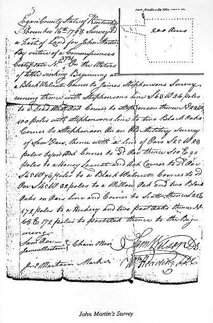 James Martin -- 67 acres, and 200 acres, 10/24/07, Big Muddy Creek. Wm. Martin -- 200 acr es, 1 1/ 10/ 10 Mots Lick Cr. 3. Apart from the grants, entries, warrants and deeds, these are the land surveys. The definitive list of Kentucky surveys is contained in two books: