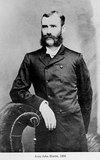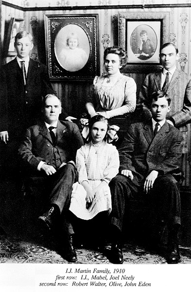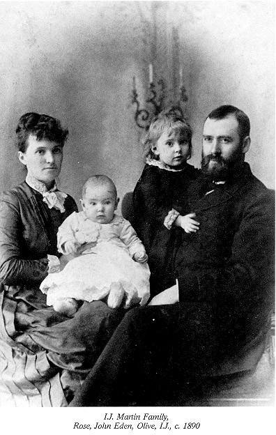 Ivory J. (or John Ivory) Martin was born November 7, 1859. Rose Eden Martin was born November 2, 1858; she died November 5, 1907. They were married Wednesday, June 30, 1886, Thomas E. Edwards officiating clergyman. Children: Olive Eden Martin, April 29, 1887. John Eden Martin,, April 19, 1889. Joel Neely Martin, January 13, 1891. Elvina Martin, December 21, 1892; died December 25, 1896. Robert Walter Martin, February 16, 1895. Mabel Eden Martin, January 8, 1899.