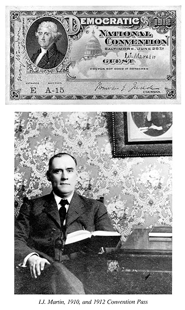 IVORY JOHN MARTIN IVORY J. MARTIN* *Portrait and Biographical Record of Shelby and Moultrie Counties, Illinois, Chicago, 1891, pp. 160-61. The power of the press is a trite but a forcible subject, for it is one of those themes which is constantly reinforcing itself by proving anew every day its reality. Throw out of account the influence which is exerted by the newspapers of Illinois, the destinies of the Prairie State would be largely affected by such elimination. The sketches which we have been called upon to give of the newspapers and editors of Moultrie County present matters which are of interest to everyone. The Sullivan Progress has been from the first a success and it now occupies first rank with the best papers in this part of the State and has a well-equipped office for job work and all kinds of printing. It was originally issued in 1857 under the caption of the Express, but was soon changed in title to the name which it now bears. Mr. Martin has been its editor and manager since 1885 and added to those duties its proprietorship in 1887. It is now a seven-colunm six-page paper with a good circulation and is issued weekly. Mr. Martin, who came to Sullivan, Moultrie County, in 1883, on account of having been appointed Deputy County Clerk by Mr. Charles Shuman, took charge of this paper after the expiration of his term of office, and has now taken Mr. Shuman as his partner in the management of the business. This was his first newspaper work but he proved himself no amateur in the business. Mr. Martin was born in Whitley Township, Moultrie County, November 7, 1859, and was there reared upon his father's farm and received his education at Lee's Academy at Loxa, Coles County. For seven years he taught in Coles and Moultrie Counties, having taken his position at the teacher's desk before reaching the age of seventeen, obtaining his academic course during the same years that he devoted to teaching. He came of a family that has resided in the county for many years, as they settled here in the '30's. The father, John N. Martin, was born in Coles County, this State, and was only five years old when the family removed to what is now Moultrie County. He is still carrying on the farm in Whitley Township and is the son of John Martin, a native of Kentucky, a grandson of James Martin, a Virginian, and a great-grandson of John Martin, who migrated to Kentucky about the year 1777, during the Revolutionary War. The family was there in the days of Daniel Boone and had to make their home in a fort for self protection. The first John's son James was very young when the family came to Kentucky and he grew up near the Kentucky River and there married, and reared his family. At a very early day he came with his household to Coles County, Illinois, and later made his home near Bruce, Moultrie County, where he died in 1865, at the very venerable age of ninety-one years, having buried his wife some twenty years before. For generations, the family religion is of the old school Baptist denomination and their politics of the Democratic order. John Martin, the grandfather of our subject was a young man when his parents came to Illinois and he here reached his majority and married a Miss Neely. Her father was known far and wide as an Indian fighter on the frontier and was an original character in the early pioneer days. In his later years John Martin removed to Whitley Township, Moultrie County, and built a mill there. John N. Martin, the father of our subject, is one of a family of four sons and three daughters who are all living. He grew to manhood to Whitley Township and was married in Coles County to Miss Rachel Martin, who as well as her husband, is now living, having reached nearly three-score years of age. Of their children who are now living, our subject is the eldest, the others being Joel K, who is studying law under the Honorable John R. Eden, of Sullivan, and Nancy E., who is yet at home with her parents. Our subject was married in Sullivan in 1886 to Miss Rose Eden,, daughter of the Honorable John R. Eden, of whom more can be learned in the sketch of that gentleman which appears in this volume. The subject of our sketch has ever taken an active part in local politics since he became of age, but is no office seeker. His paper is Democratic as are also his own political views. He is a man who is capable of a vast amount of hard work and he is exceedingly skillful in the management of his business. His wife was reared in Sullivan and is a graduate of the Georgetown Convent in the District of Columbia. She is an earnest member of the Christian Church and is the mother of three children Olive, Eden and Neely.