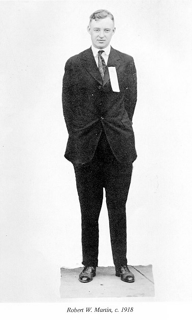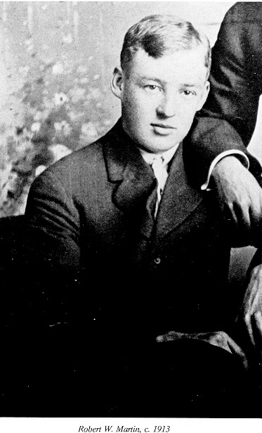 fullback. The team traveled to out-of-town games by train. The final game was with - the alumni, quarterbacked by Harold Pogue, later a star at the University of Illinois, and a life-long friend of Father's. The Retrospect writer reports that, "The crowd behaved badly. It seems as if the crowd thought the field was for them instead of the players." At the end of The Retrospect appears a section entitled "Humorous." This includes a "Senior Classification" listing all seniors and their supposed ambitions, what they were noted for, their favorite pastimes, and their favorite phrases. "Bob Marti n" (note: not "Walter") is described as having the ambition "to be left alone" -- as being noted for "working???" with a favorite pastime of "winking," -- and with a favorite phrase, "Now you hush." A listing of humorous events contains the following: "On e evening Bob Martin, Twenty Wolf, Brownie Lee, Frank Smith, and Omar Hill, shot nickels at a crack to see who would take Thelma Barton home from town. Brownie won." Other witticisms: "Bob, Twenty and Brownie were so fond of first year Latin that they to ok it three years." And, "There must be hard work in him, for none ever came out -- Bob Martin." The school year ended with a junior/senior banquet on May 2, 1913, with the "Sullivan Orchestra" furnishing the music. Commencement took place on May 29. Having graduated, the question then arose what Father was going to do next. In the fall of 1913, he briefly attended the University of Illinois at Champaign. He told me once that he was only there a few weeks, and that he withdrew for two reasons. One was that he broke his finger playing football on the Illinois freshman team. As an adult, he continued to have one finger joint stiff from the injury. That, he said, was discouraging. The other reason was that he ran out of money. It is not at all cle ar how much Grandfather was able -- or willing -- to help. Rose Eden Willis told me