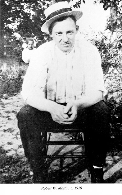 29. ROBERT WALTER MARTIN R. Eden Martin Robert Walter Martin, my father, was born on February 16, 1895, in Sullivan, Illinois. He was the son of Ivory John and Rose Eden Martin. Rose Eden was the daughter of John Rice and Roxana Meeker Eden. Grandfather I.J. Martin believed that our Martin ancestors were of English extraction, and that they had moved from Virginia into Kentucky about 1780. The family lived somewhere in Central Kentucky from about 1780 until 1797, when they moved to Logan Cou nty in Southwest Kentucky. From about 1797 until about 1817, "Old John" Martin and his family (wife "Sarah" and children, including James Scott Martin and William Harvey Martin) had lived on a farm east of Russellville in Logan County -- a farm later acq uired by a prominent Russellville family, the Bibbs. Then about 1817 the family moved from Logan County into Southeastern Illinois. James Scott Martin (our line) settled first in Crawford County, just across the Wabash River from Vincennes; William Harv ey Martin (his brother) settled in Lawrence County. Later these families moved to Coles County, and then, in the 1830's, to the area of Whitley Creek, about 10 miles southeast of Sullivan, in what later became Moultrie County. Grandfather Martin was bor n in 1859; and in 1883 -- at the age of 23 -- he moved into Sullivan and went to work in the County Clerk's office. He married Rose Eden on June 30, 1886 -- a marriage arranged (as Olive Ruth Hewett, one of I.J.'s granddaughters remembers being told) by John R. Eden, Rose's father. Father was the next to youngest child of this family. The eldest child was Olive -- whom I remember well as Aunt Olive, a heavy-set lady who had been a school teacher all of